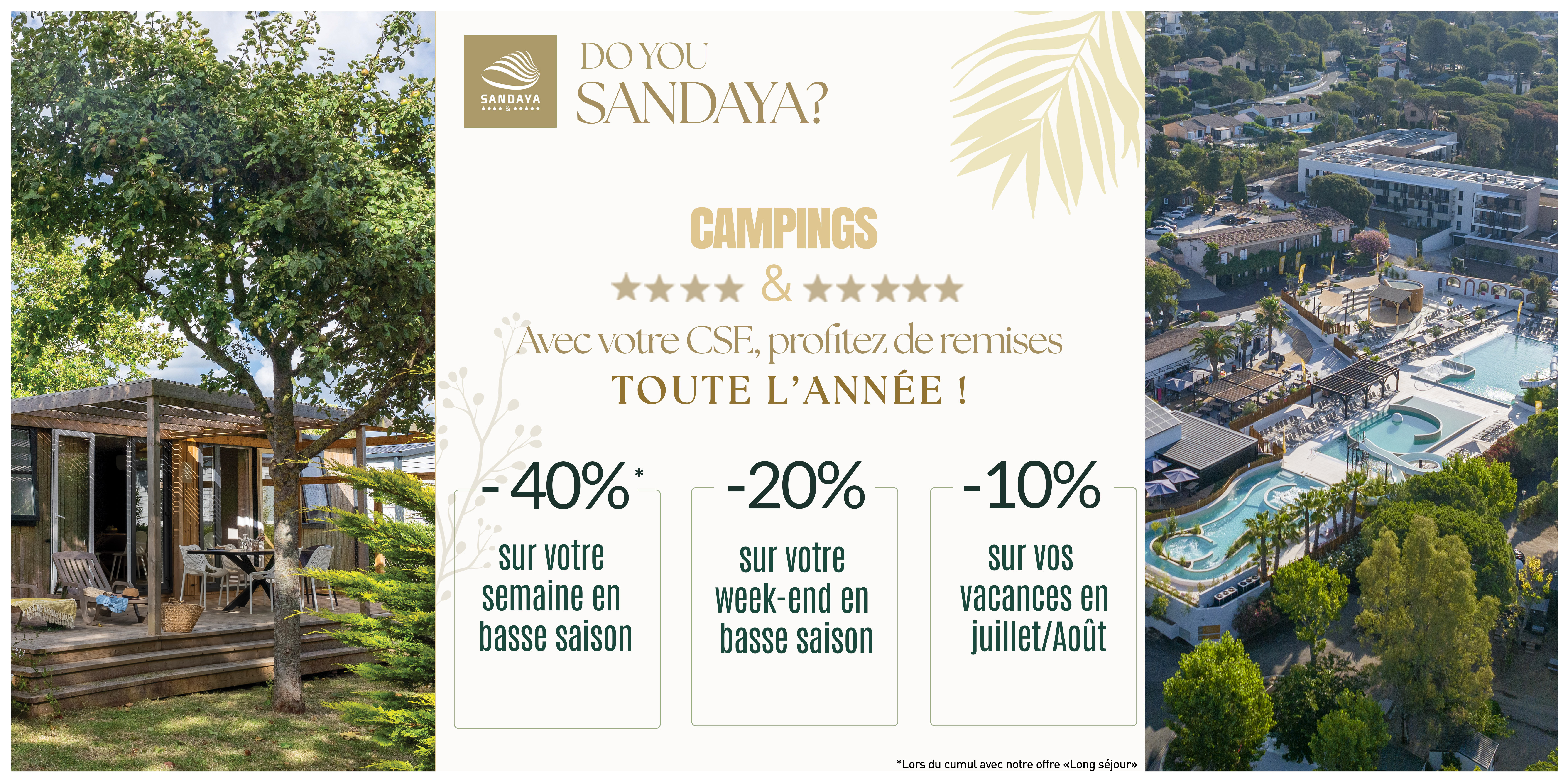 Les campings SANDAYA c’est : 62 campings 4 et 5 étoiles en France, Espagne, Belgique et en Italie.